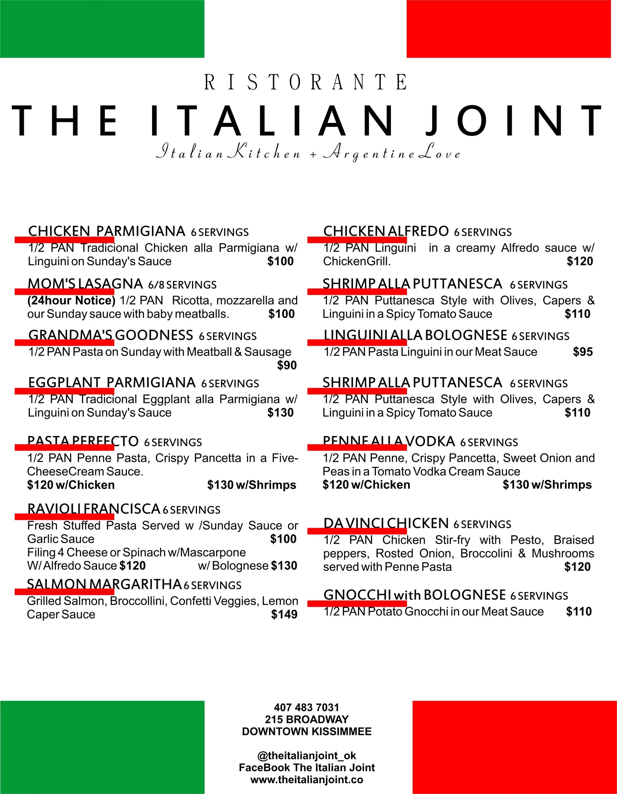 Grandma´s Goodness - Chicken Alfredo- Shrimp Dish- Linguini alla Bollognese- Chicken alla Parmigana-Penne alla Vodka- Pasta Perfecto-
